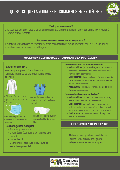Recherche des zoonoses en animaleries, ainsi que leur mode de transmission et les bons gestes à adapter et les EPI a porter pour empêcher l’arrivé et la propagation des zoonoses.